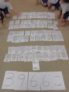 10月14日 3年生 算数 大きな数先日採取したひまわりの種の数を数えました。 今までの算数の学習から「10のまとまりを作れば、間違えずに数えられる。」と計画を立て、集中して数を数えました。 全部で3966つぶ!「予想よりたくさんあった。」と大喜び!! 来年も麻生東小学校にたくさんのひまわりが咲きますように・・(*^_^*)