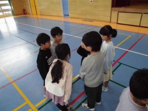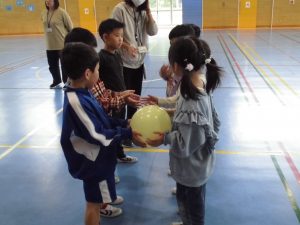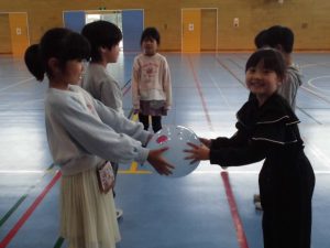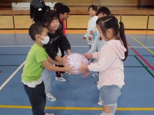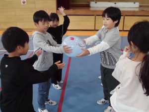 1年生では、友達と協力して風船を受け渡す活動をおこない、グループの友達と協力し合う、息を合わせること、たがいの心を尊重することの大切さを学びました。