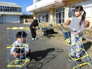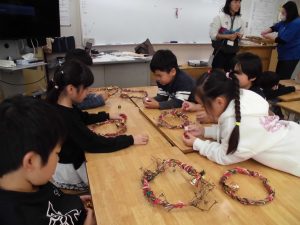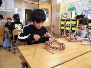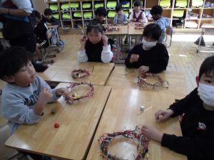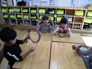 1年生が大切に育てたあさがお、花を咲かせ、種を取り、すっかり茶色のつるだけになりました。今日は、つるを使って、リース作りに挑戦しました。きれいな飾りをつけて、素敵なリースに仕上がりました。