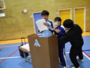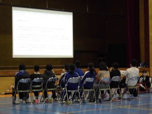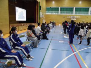 会の後半には、6年間の思い出を振り返るスライドショーを上映しました。さらに、異動された恩師からの心温まるメッセージも紹介され、6年生は懐かしそうに見入っていました。
