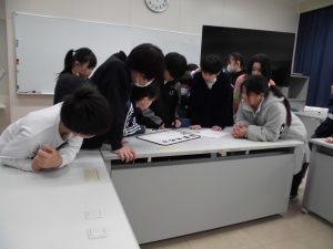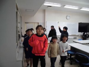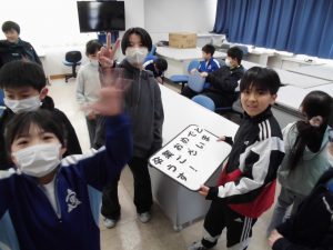 開会行事のあと、縦割り班ごとに校舎内を巡る「探検クイズ」を実施しました。校舎内にいる先生を見つけて声をかけ、麻生東小学校に関するクイズを出してもらい、正解したらカードをもらいます。カードをすべてそろえると「卒業おめでとう」のメッセージが完成する仕組みで、どの班も協力しながら楽しく活動する姿が見られました。