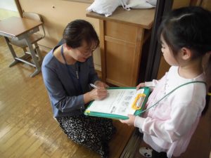 4/24 がっこうにいるひとと なかよくなろう!1年生の生活科の学習で、学校にいる先生に名前やお仕事をインタビューする活動を行いました。
