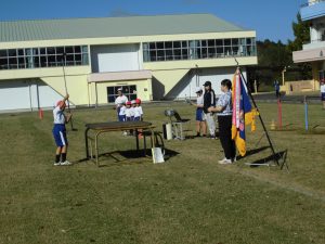 朝から青空が見える中、グランウンドで全体練習が行われました。 開閉開式の練習をしました。