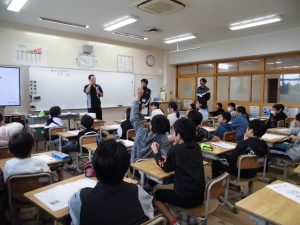 4年生の総合的な学習の時間では、福祉についての学習に取り組んでいます。本日は、福祉協議会の方から、目の不自由な方との接し方などを教えていただきました。また、アイマスクをして白杖をついて歩く体験や支援の体験をしました。
