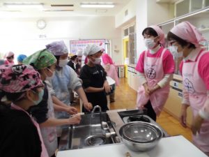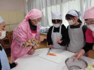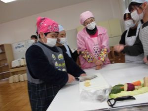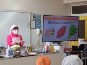 「郷土食」「けんちん汁」「行方市特産の野菜」について説明を受けた後、実際に野菜を切り、けんちん汁作りに挑戦しました。「さつまいも」は学校農園で収穫し、昨日自分たちで洗って用意した物です。