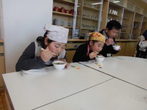 3年生の総合的な学習の時間に行方市食生活改善委員の皆様にご協力いただいて、郷土食に関する学習をおこないました。 「郷土食」「けんちん汁」「行方市特産の野菜」について説明を受けた後、実際に野菜を切り、けんちん汁作りに挑戦しました。「さつまいも」は学校農園で収穫し、昨日自分たちで洗って用意した物です。 野菜たっぷりのけんちん汁をみんなで、おいしくいただきました。
