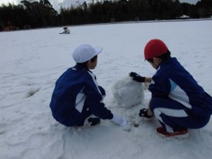 子供たちは、雪が残っているグラウンドで、手や頬を真っ赤にしながら雪遊びをしていました。