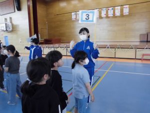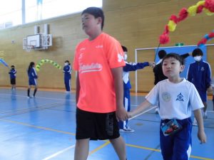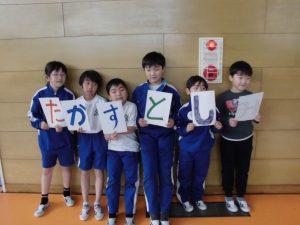 ゲームでは、全員にひらがな一文字が書かれたカードを持って「言葉作りゲーム」に挑戦しました。なかには、市長さんの名前を作り上げたグループもあり、会場は大いに盛り上がりました。1年生も終始笑顔で参加し、学校全体が温かい雰囲気に包まれました。