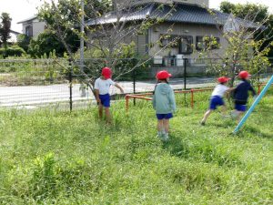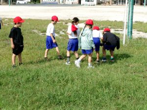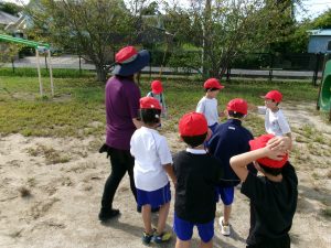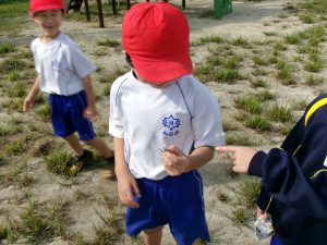 今朝は涼しくなり、秋を感じます。外で生き物を探している1年生です。バッタやトンボを見つけては、はしゃぎながら観察をしていました。