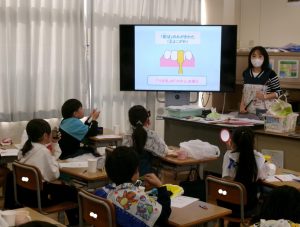 11月を「麻生っ子 いきいき歯ッピー月間」と位置付けて、規則正しい生活及び歯と口の健康について考え、学ぶ機会を設定しています。今日は、養護教諭による歯磨き指導が行われていました。