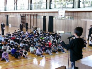 各学年を代表して、2名の児童が3学期の抱負を発表しました。体育館で対面での式や集会の経験が少ないなかでの発表でしたが、緊張しつつも堂々と抱負を述べることができました。また、学校長の式辞では「この冬休み、どんなことで心が動かされましたか?」、「本気になってがんばる姿に、人は感動し、応援したくなる」、「本気で輝く3学期!」をというエールが送られました。
