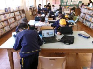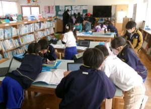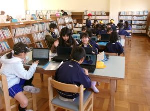 3年生のみんなは、図書室に集まって、総合的な学習の時間「霞ヶ浦の生き物プロジェクト」に取り組んでいました。資料を集め、タブレットPCを活用してプレゼンテーションの準備を進めていました。
