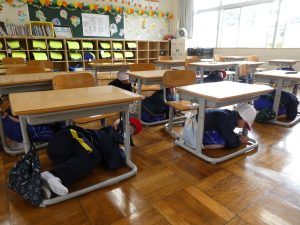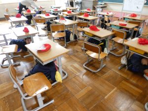 4校時、大地震を想定した避難訓練を実施しました。地震発生後、机の下に一時避難をしました。