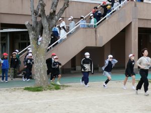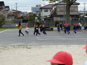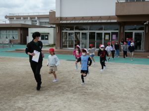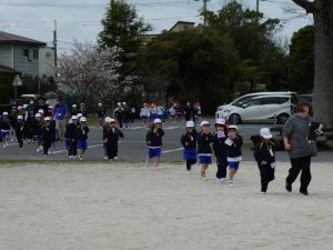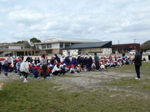 その後、余震の恐れがあるという設定で、校庭へ避難しました。