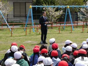 学校長から、地震に対する普段からの心構えについて話がありました。いつ発生するか分からない自然災害に対しては、日常的な備えが大切ですね。